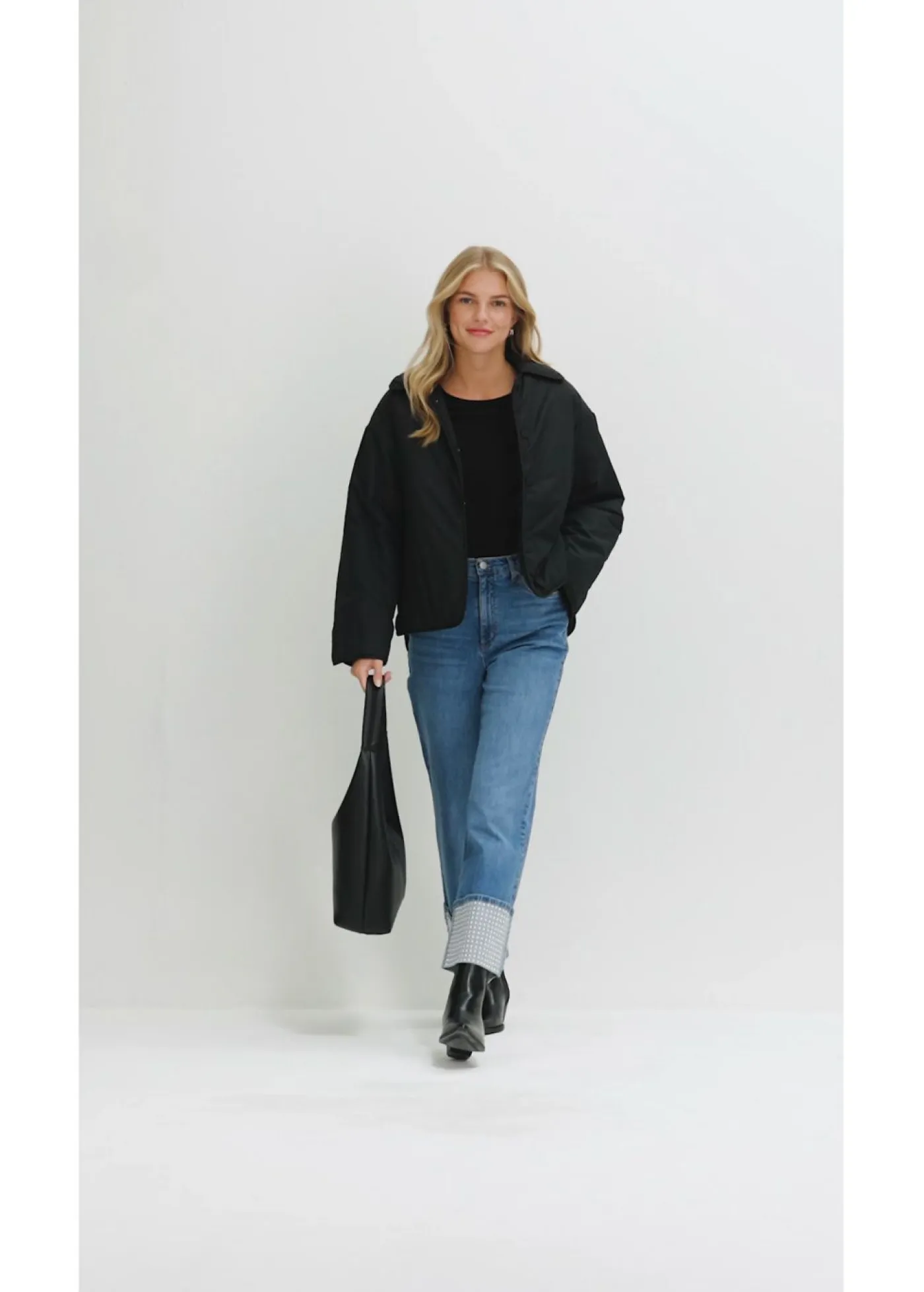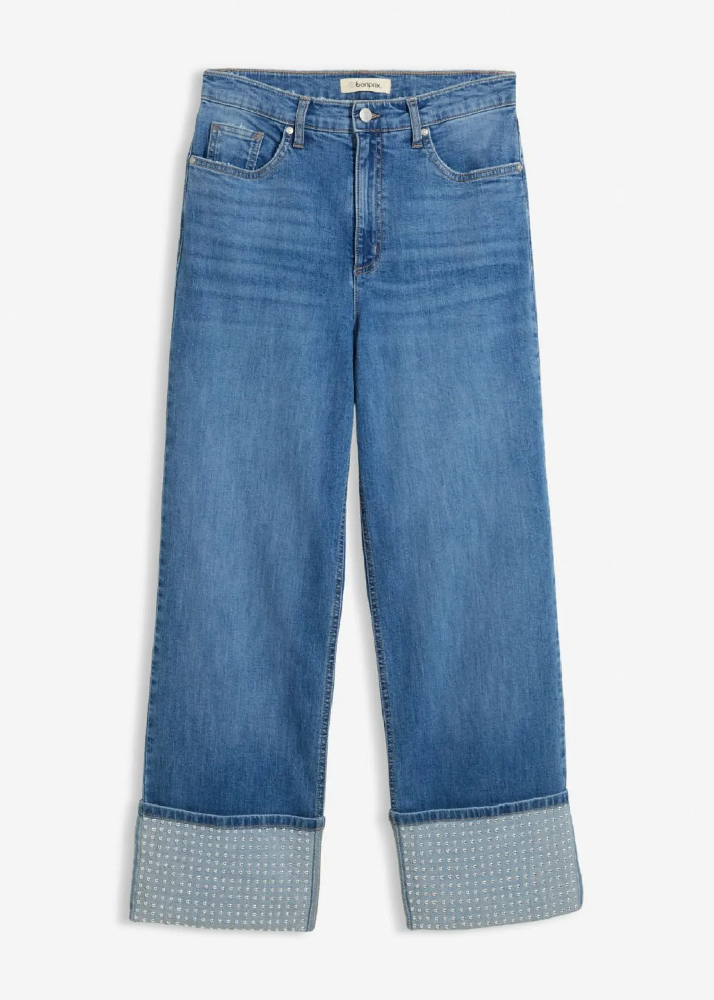Vaqueros rectos de talle alto con dobladillo decorado con piedras brillantes.