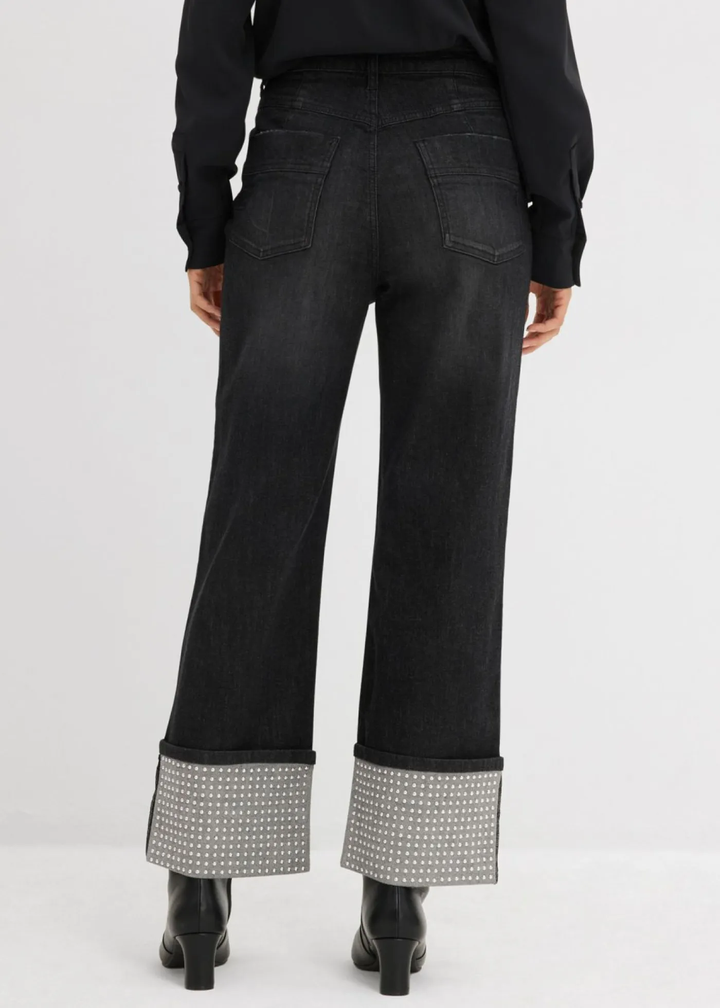 Vaqueros rectos de talle alto con dobladillo decorado con piedras brillantes.