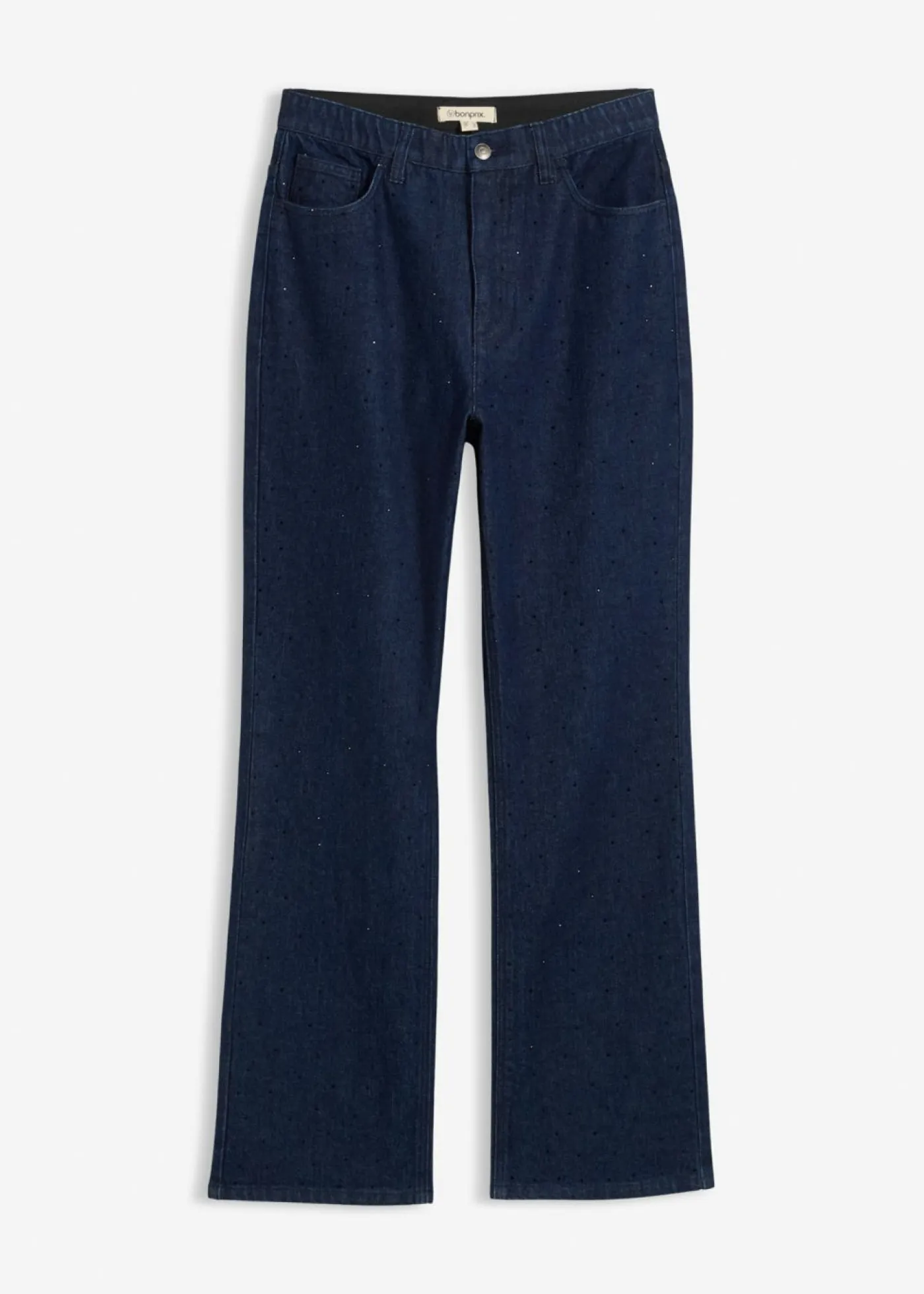 Vaqueros rectos de talle medio con corte holgado, cinturilla elástica y piedras brillantes, Largo. regular