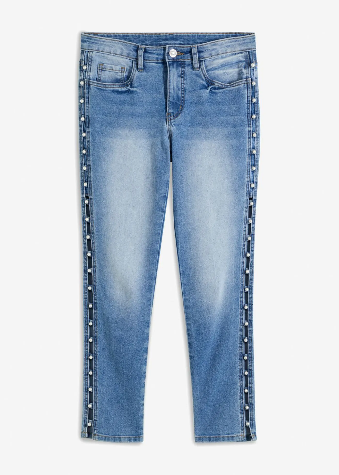 Vaqueros pitillo con modernos detalles de perlas en la costura lateral.