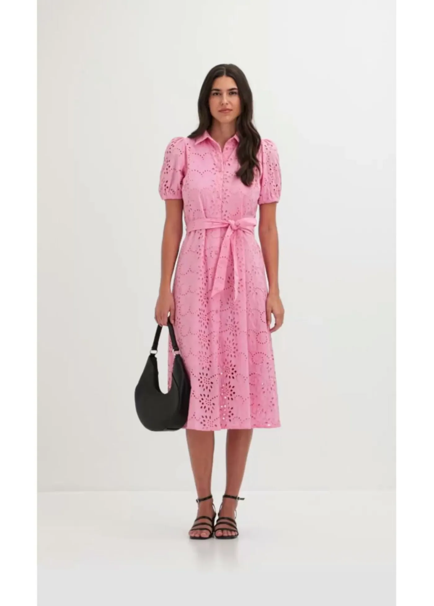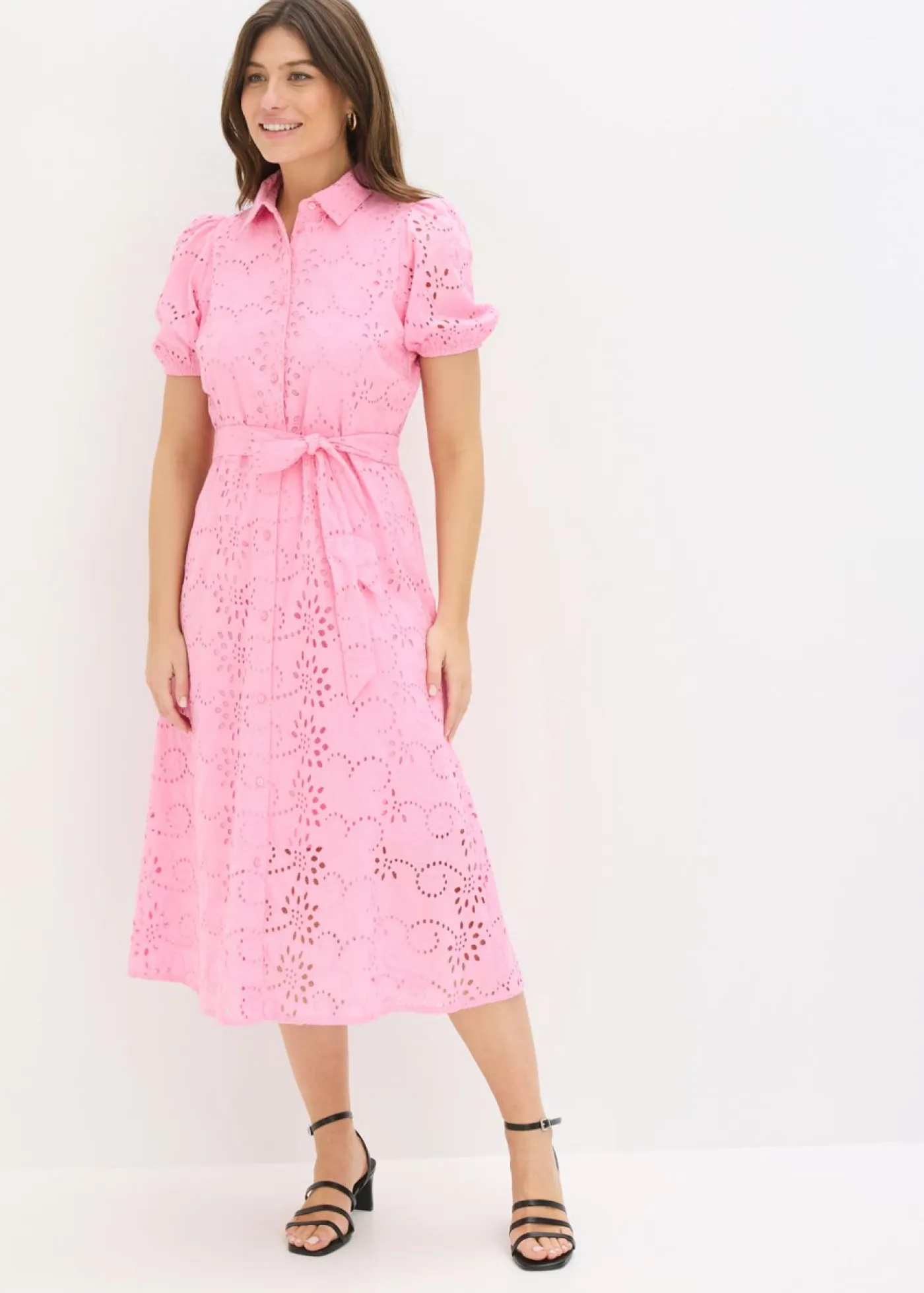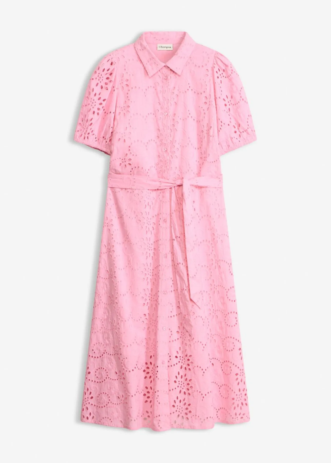 Vestido camisero femenino de punto calado de algodón puro con lazo en la cintura y mangas abullonadas.