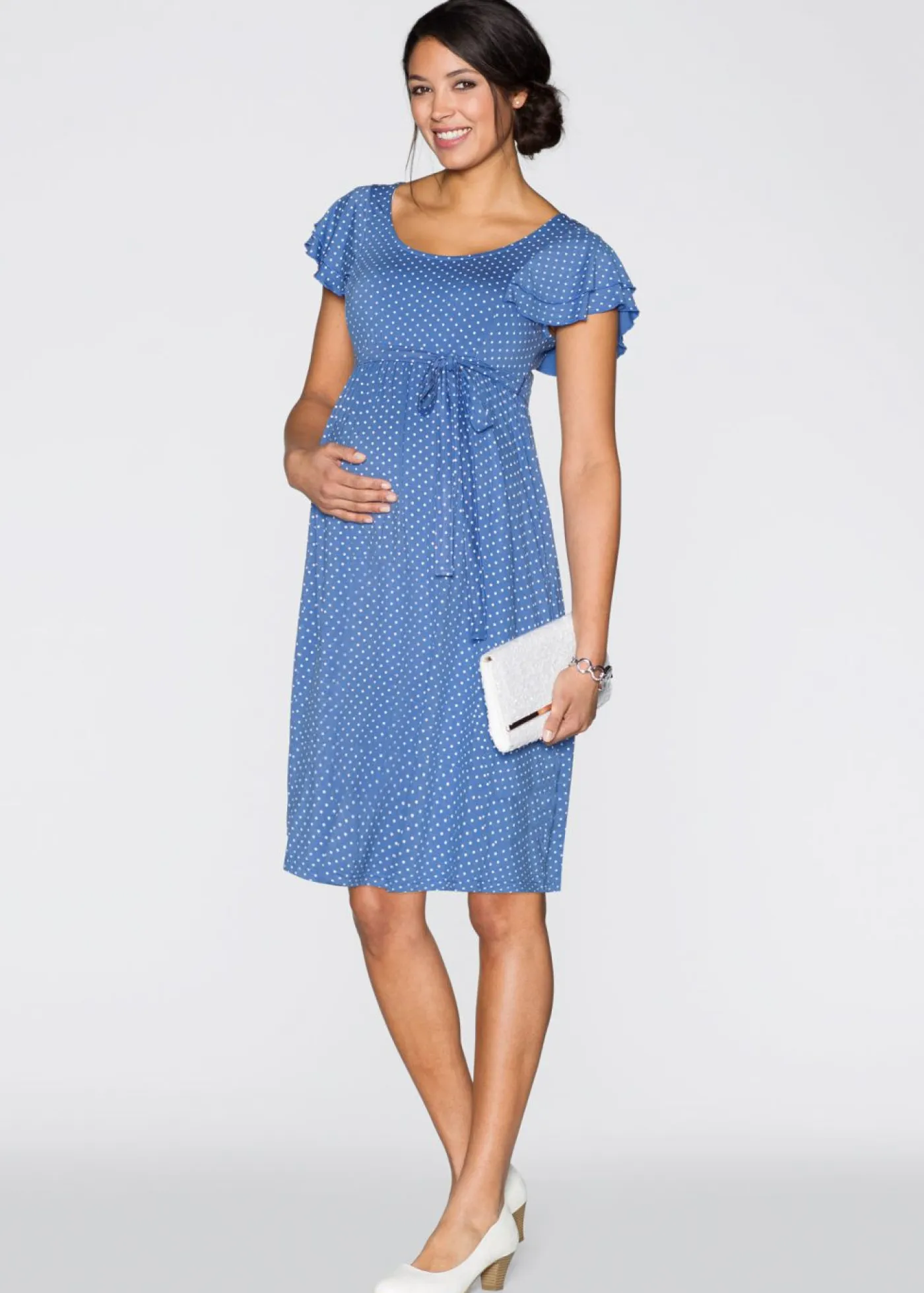 Vestido de lunares con cordón para el embarazo. Gracias al material de viscosa elástica y a los fruncidos bajo la costura del pecho, el vestido premamá ofrece un ajuste óptimo y suficiente espacio para el vientre en crecimiento. El cordón permite marcar bien la figura.