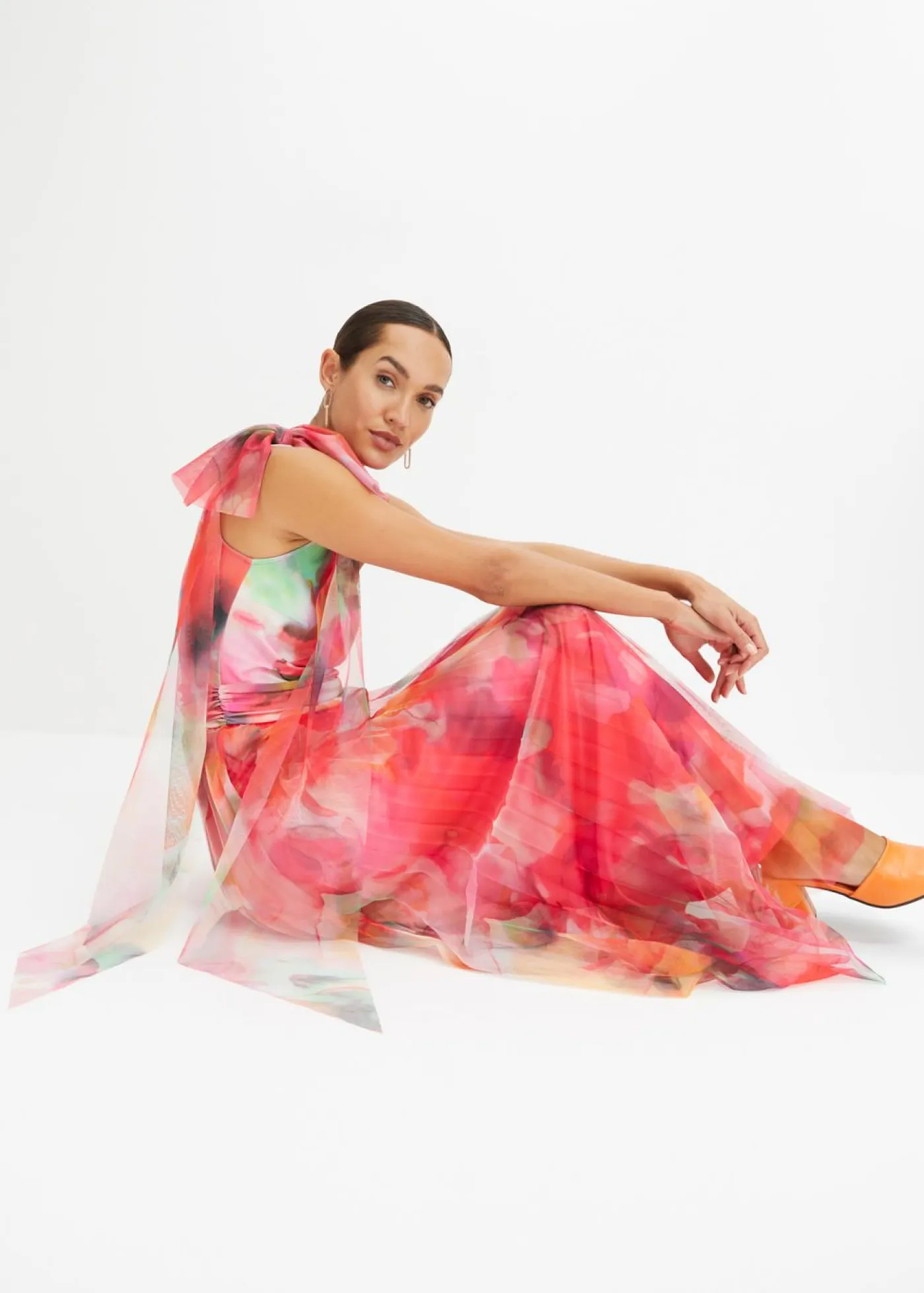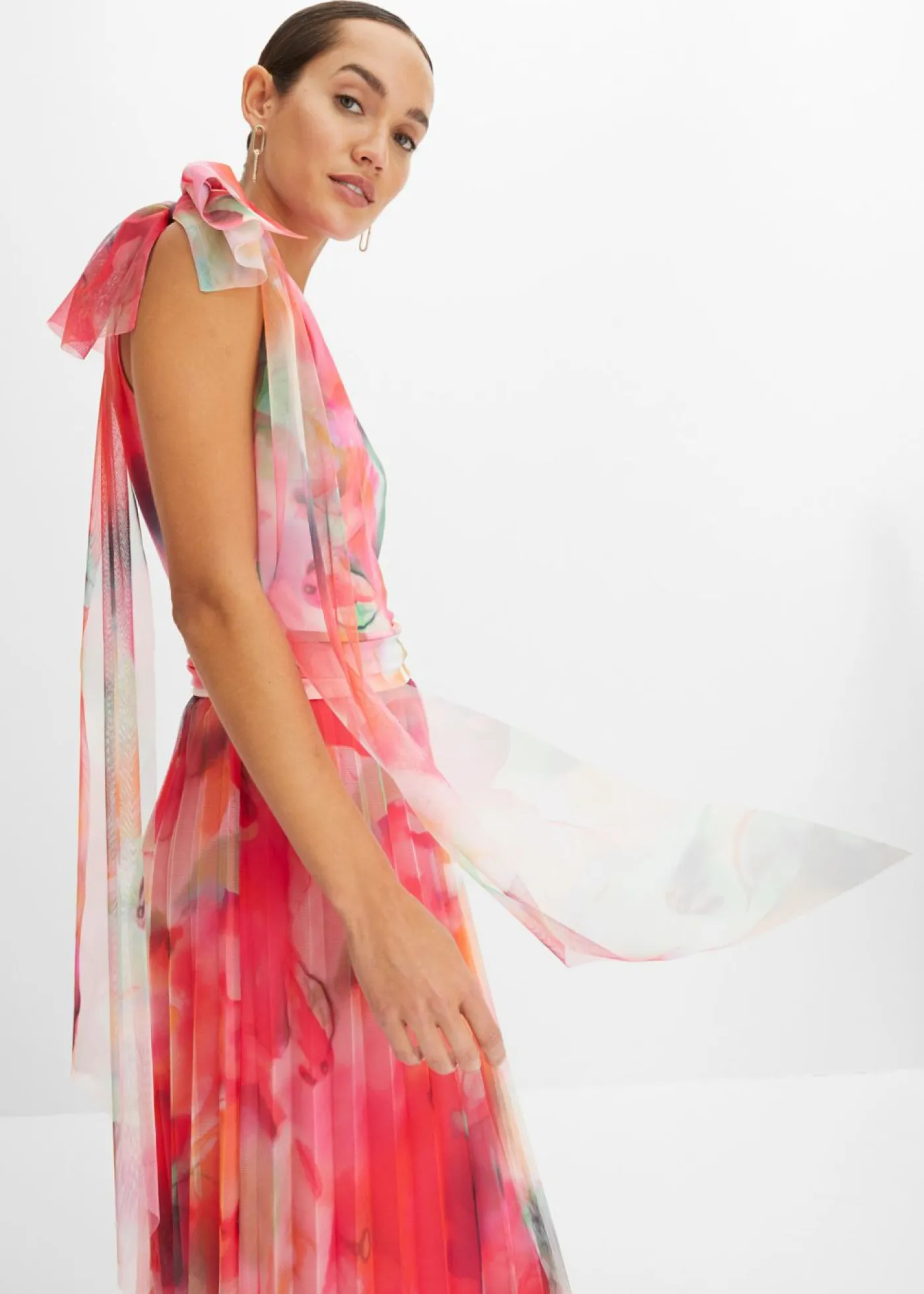 Vestido de noche con falda de tul plisado y detalle de lazo en el hombro. Con su estampado integral, cada prenda es única.