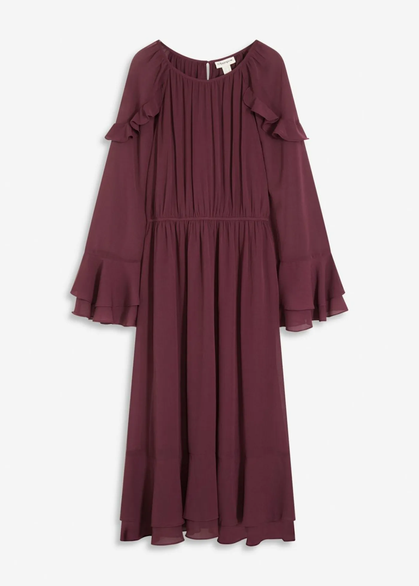 Vestido de gasa moderno, de largo midi, con volantes en las mangas y en el bajo.