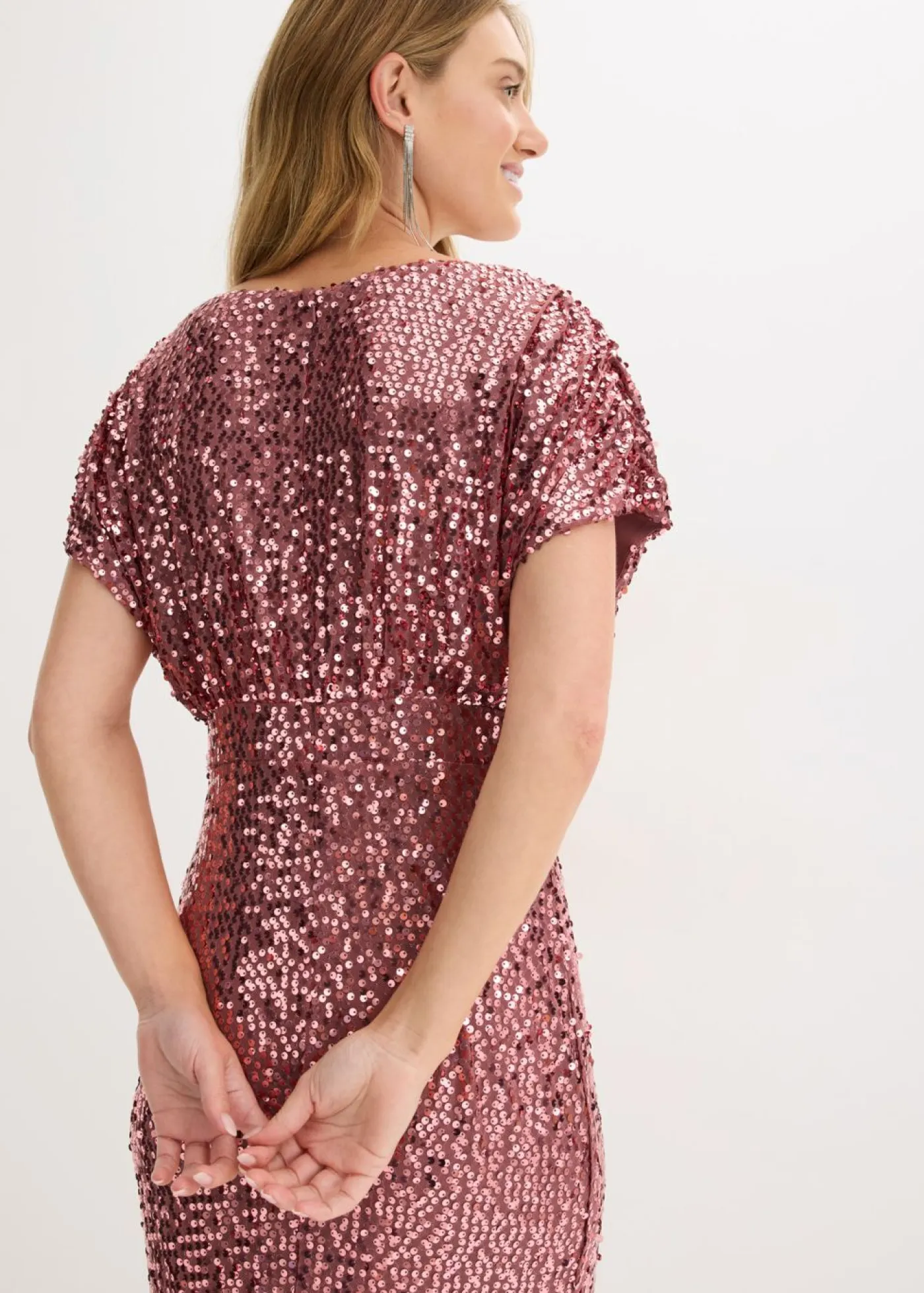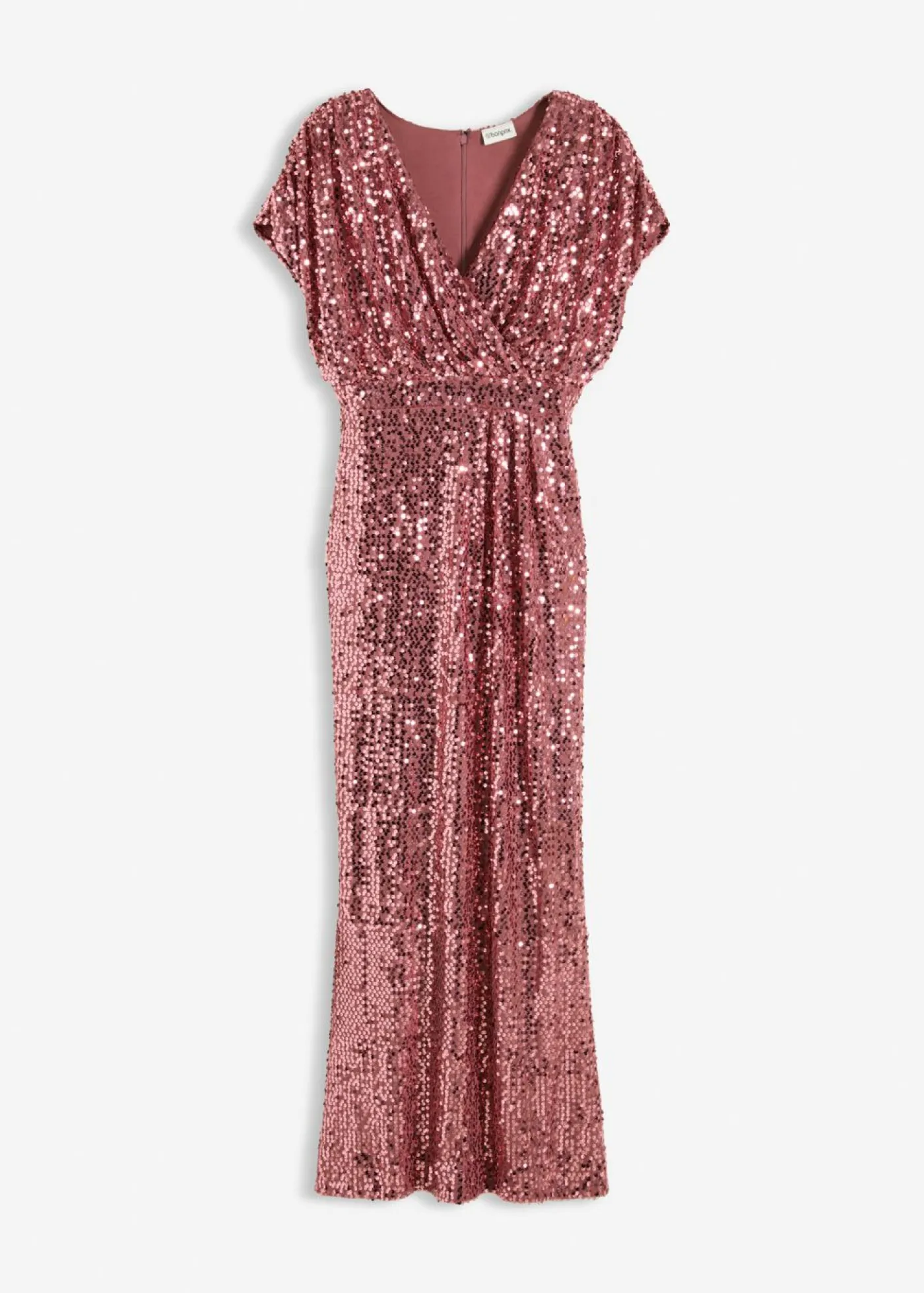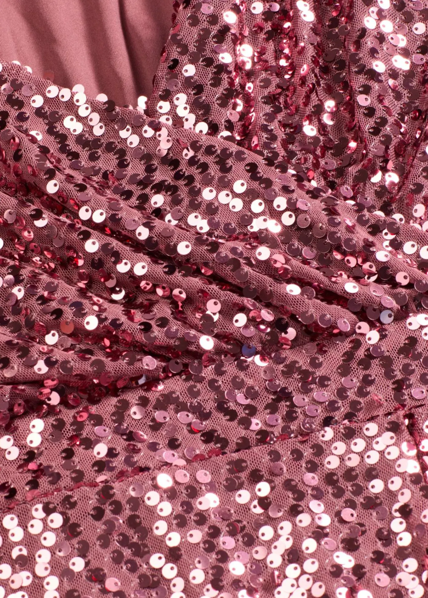 Moderno y femenino: vestido de noche con parte superior oversize y bordado de lentejuelas por toda la prenda.