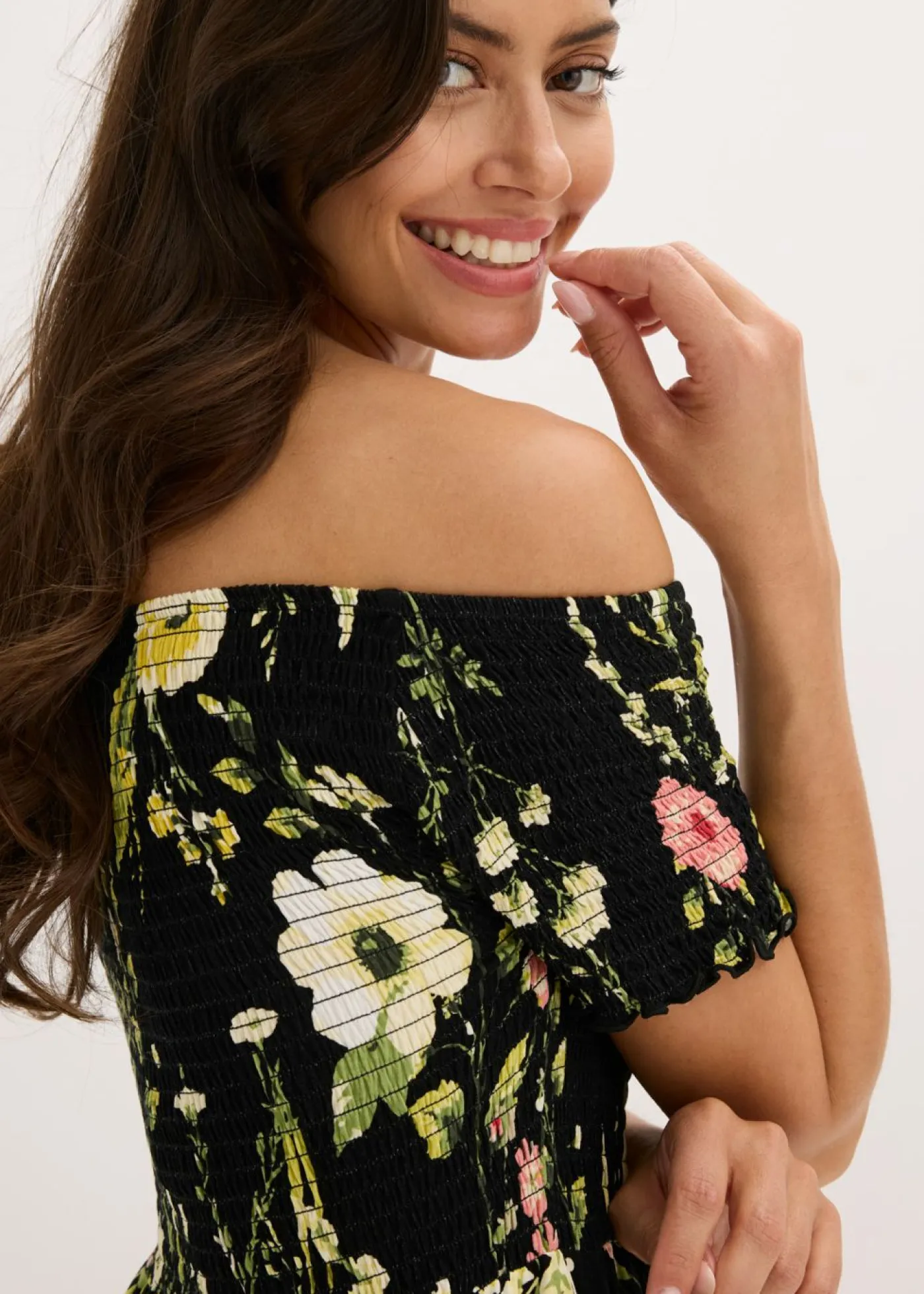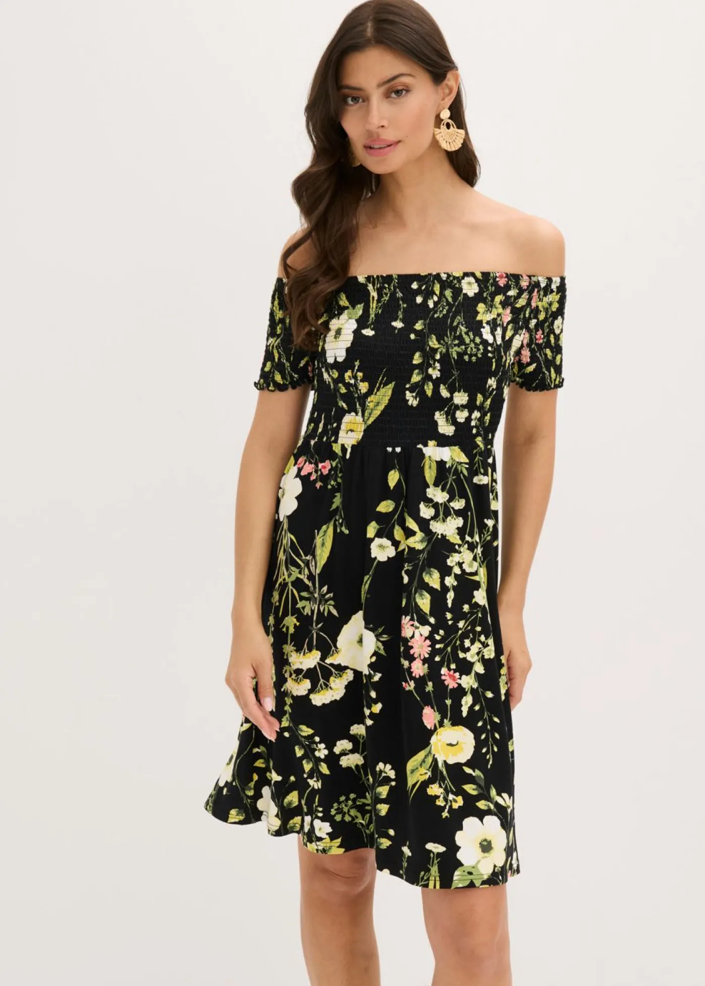 Vestido de punto de mezcla de viscosa suave con escote bañera, estampado de flores y nido de abeja en la parte superior.