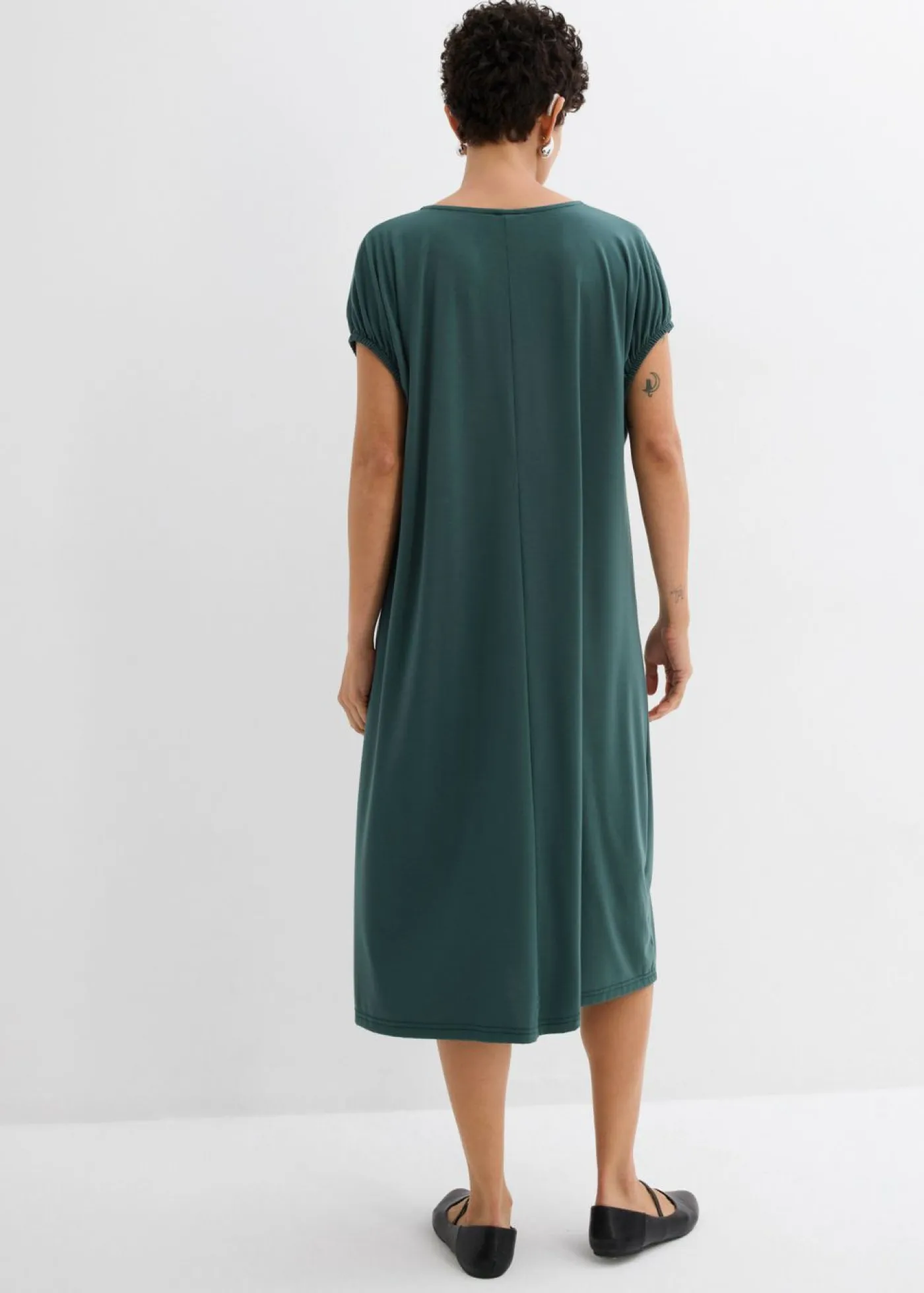 Vestido de manga corta con escote en V, bolsillos laterales y mangas abullonadas con puños elásticos.