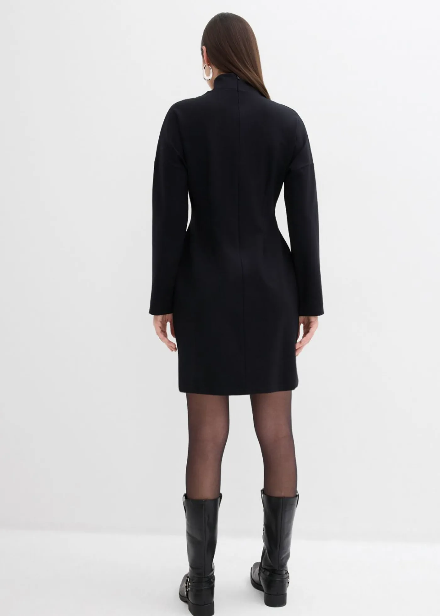 Vestido corto ajustado con cuello vuelto y mangas voluminosas.