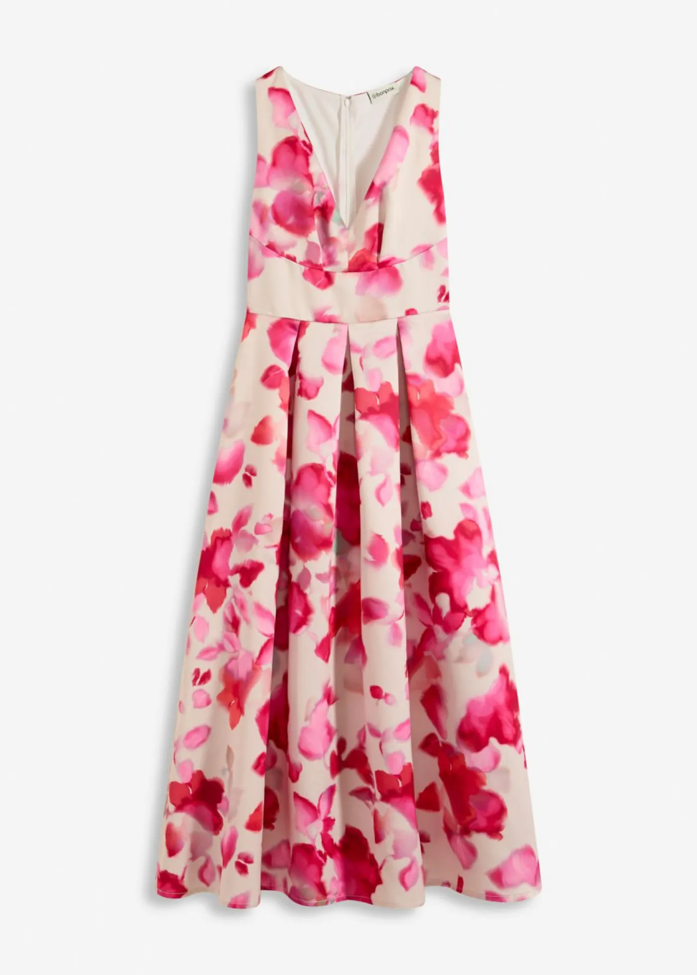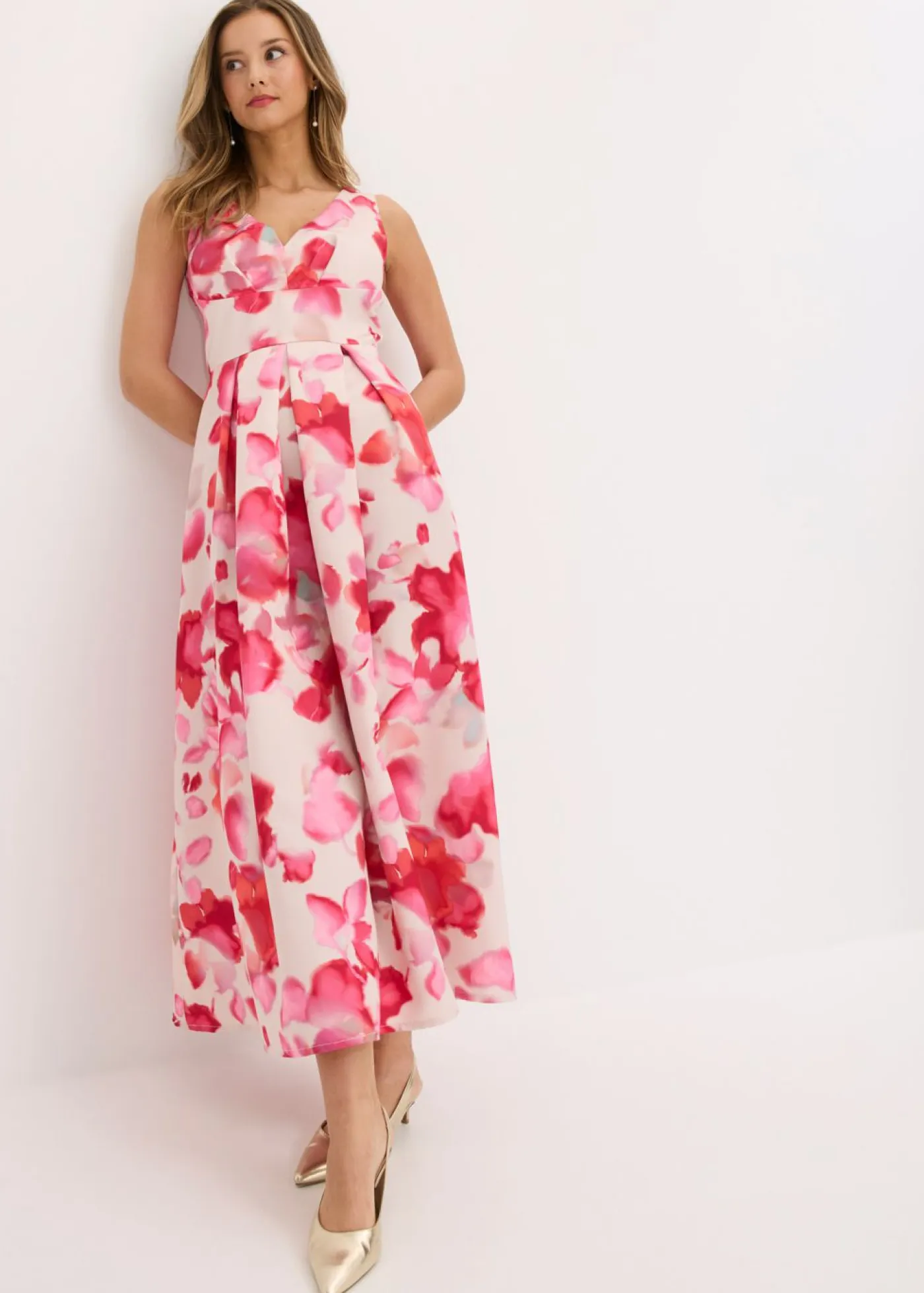 Moderno y femenino: Vestido largo con inserto en la cintura y falda plisada de satén brillante con estampado de flores.
