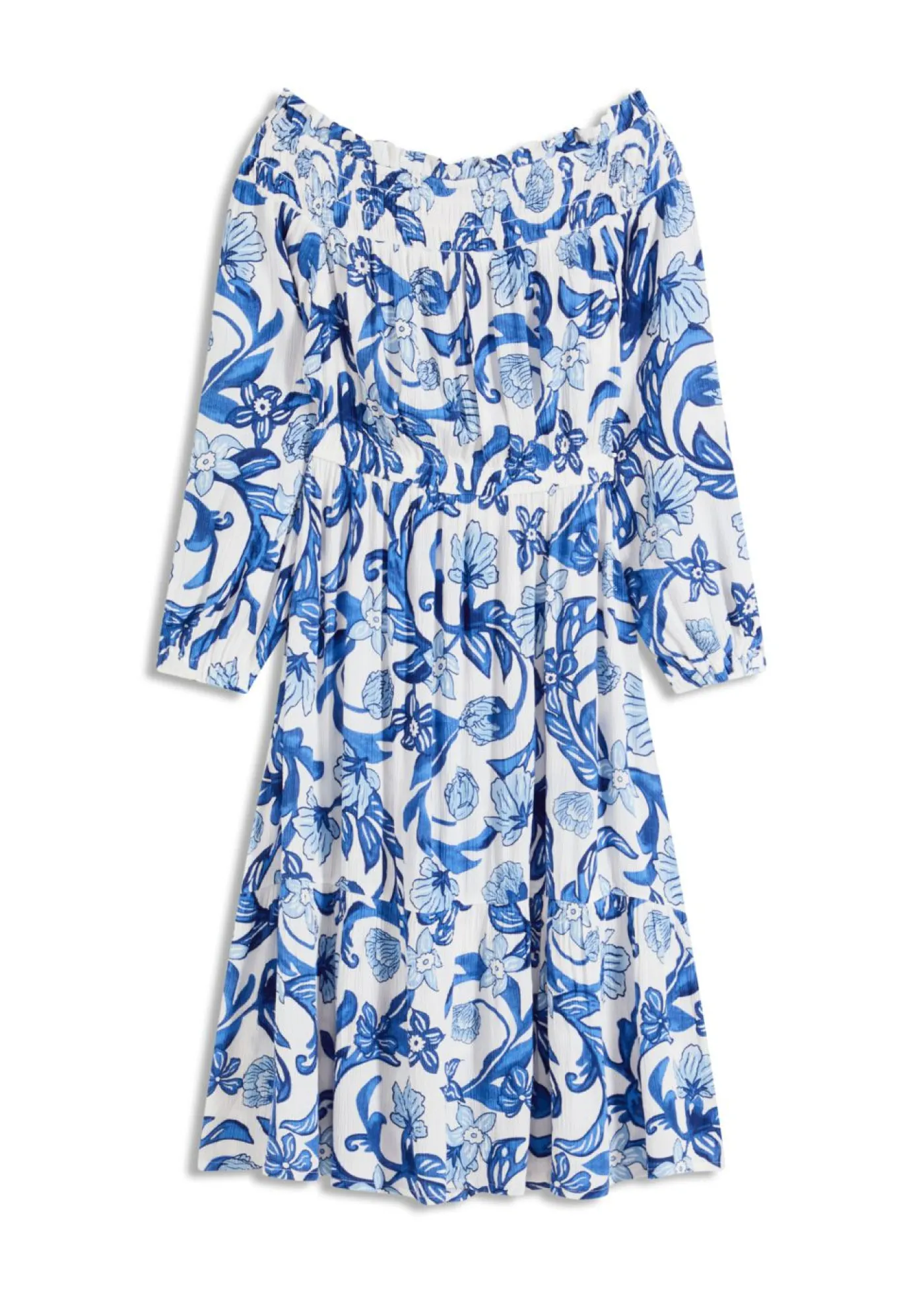 Vestido largo con escote bañera y cinturilla elástica.