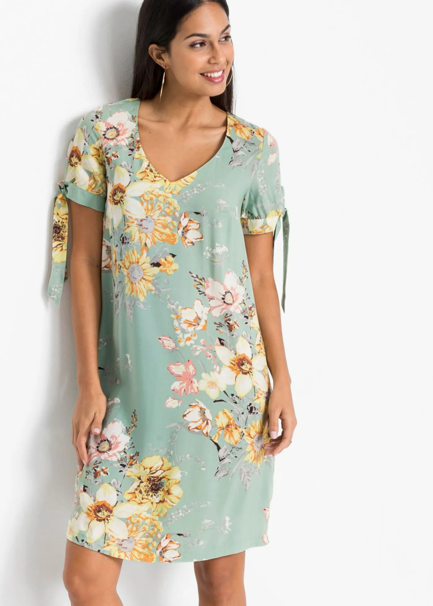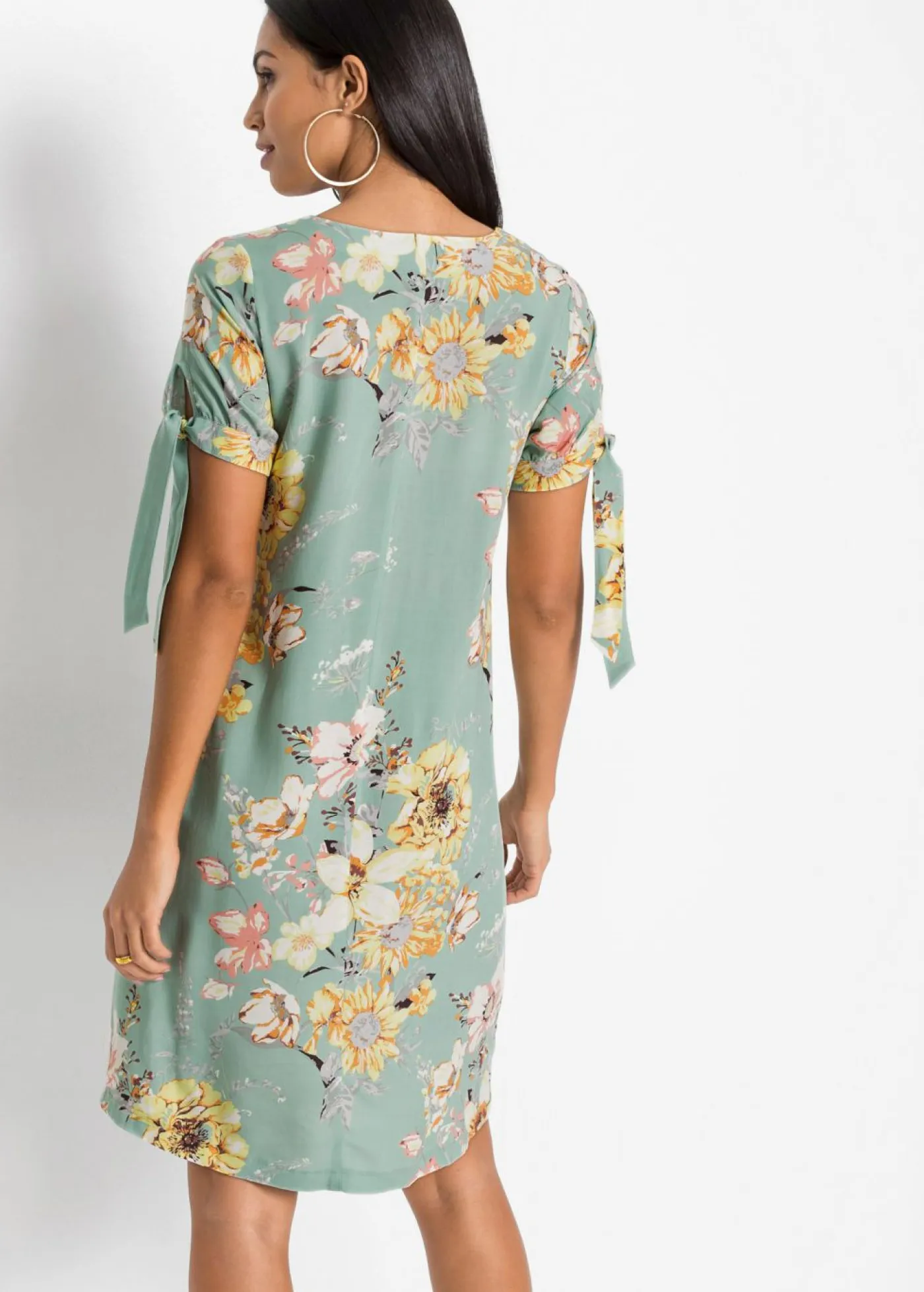 Moderno vestido de viscosa con un bonito estampado y cordones en las mangas.