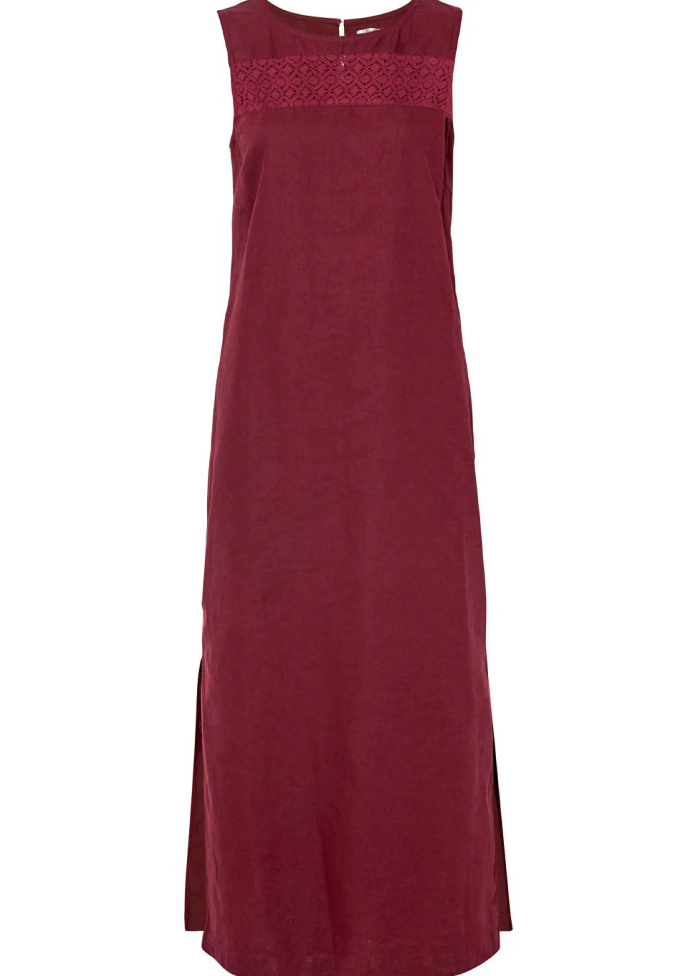 Vestido largo de lino con motivo perforado en el escote y abertura lateral