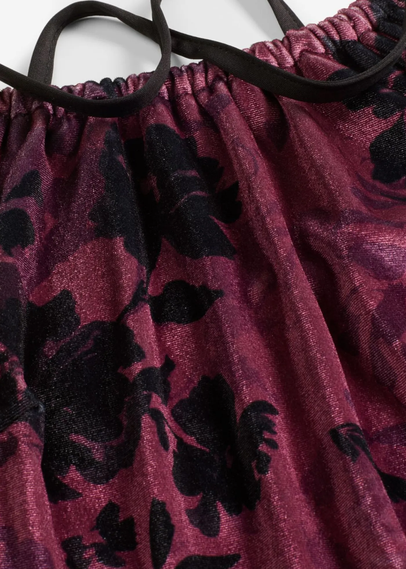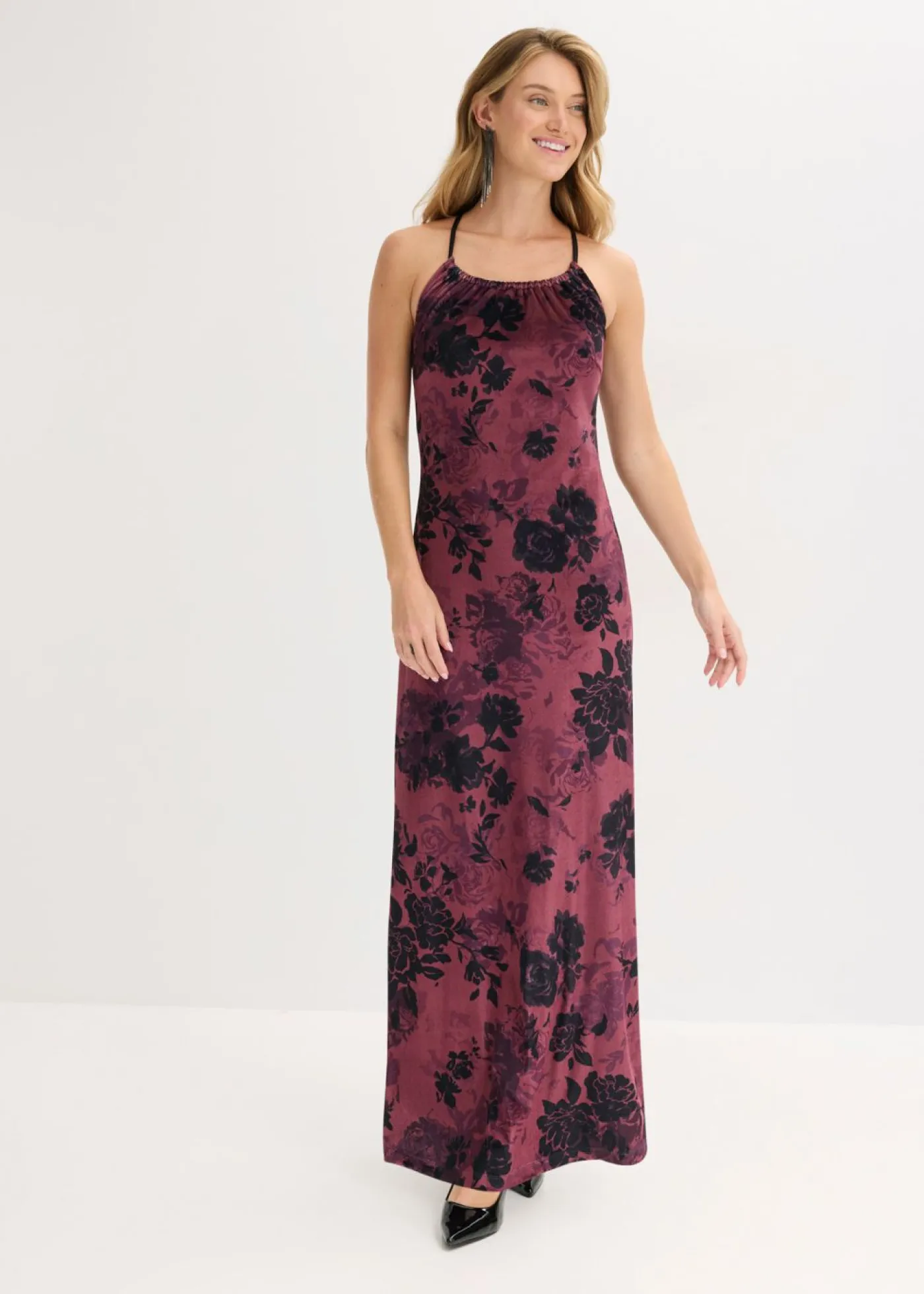 Moderno y femenino: vestido con tirantes de terciopelo brillante, largo maxi y tirantes cruzados en la espalda.