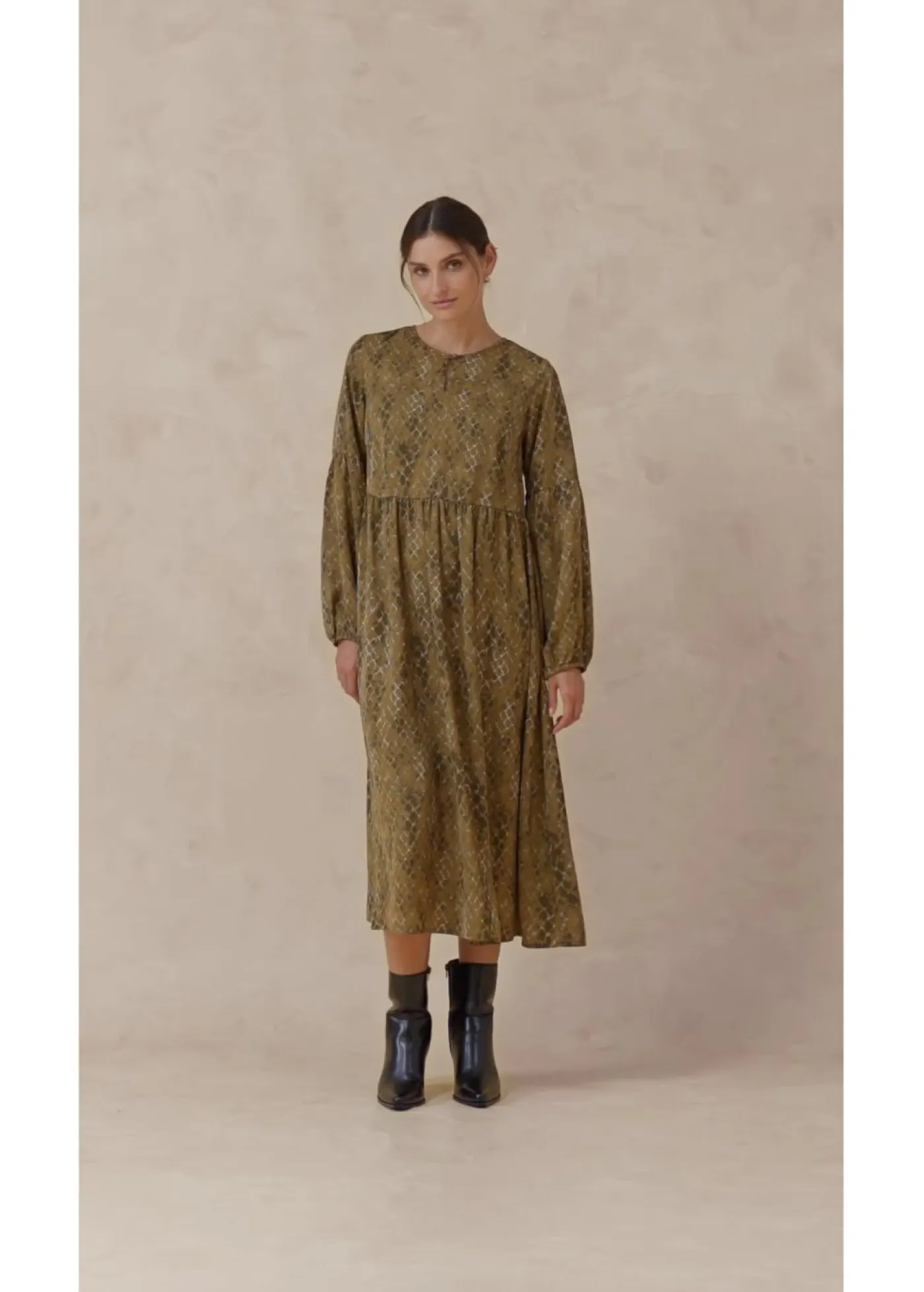 Vestido de satén con mangas voluminosas y cintura entallada.