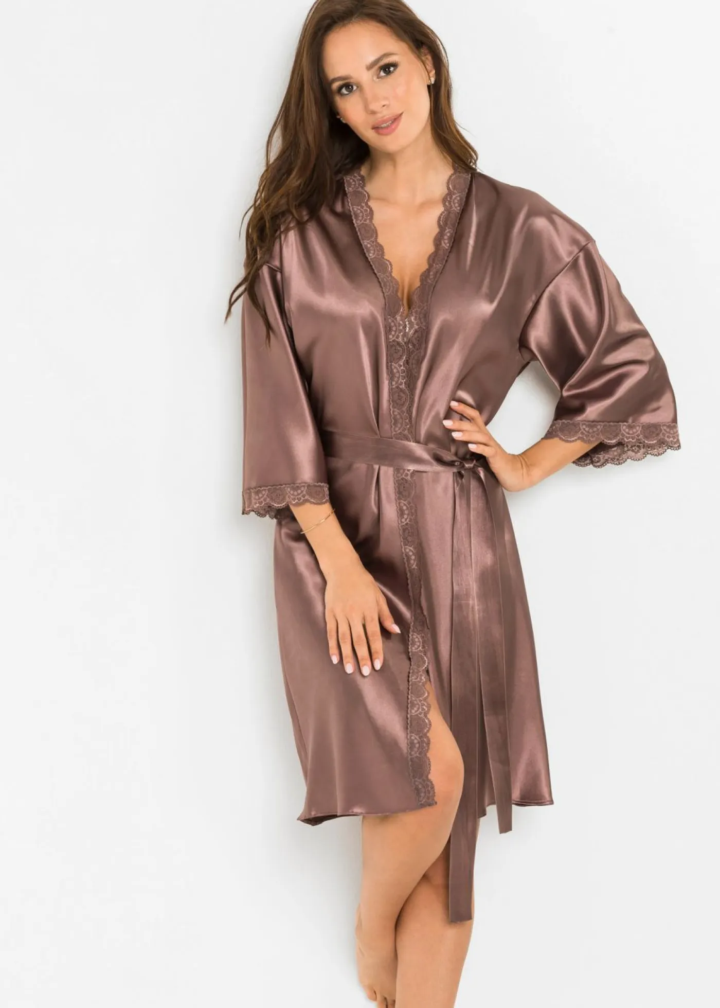 Elegante kimono de satén. ¡Conviértete en una tentación con este kimono! Abrigo ligero que puedes usar como bata, como albornoz o simplemente en cualquier momento si lo que quieres es envolverte en una tela sedosa. La tela de color marrón grisáceo de satén hace que la lencería sea un atractivo para la moda y convence por su ajuste. En la cintura encontrarás un cinturón para anudar el kimono.