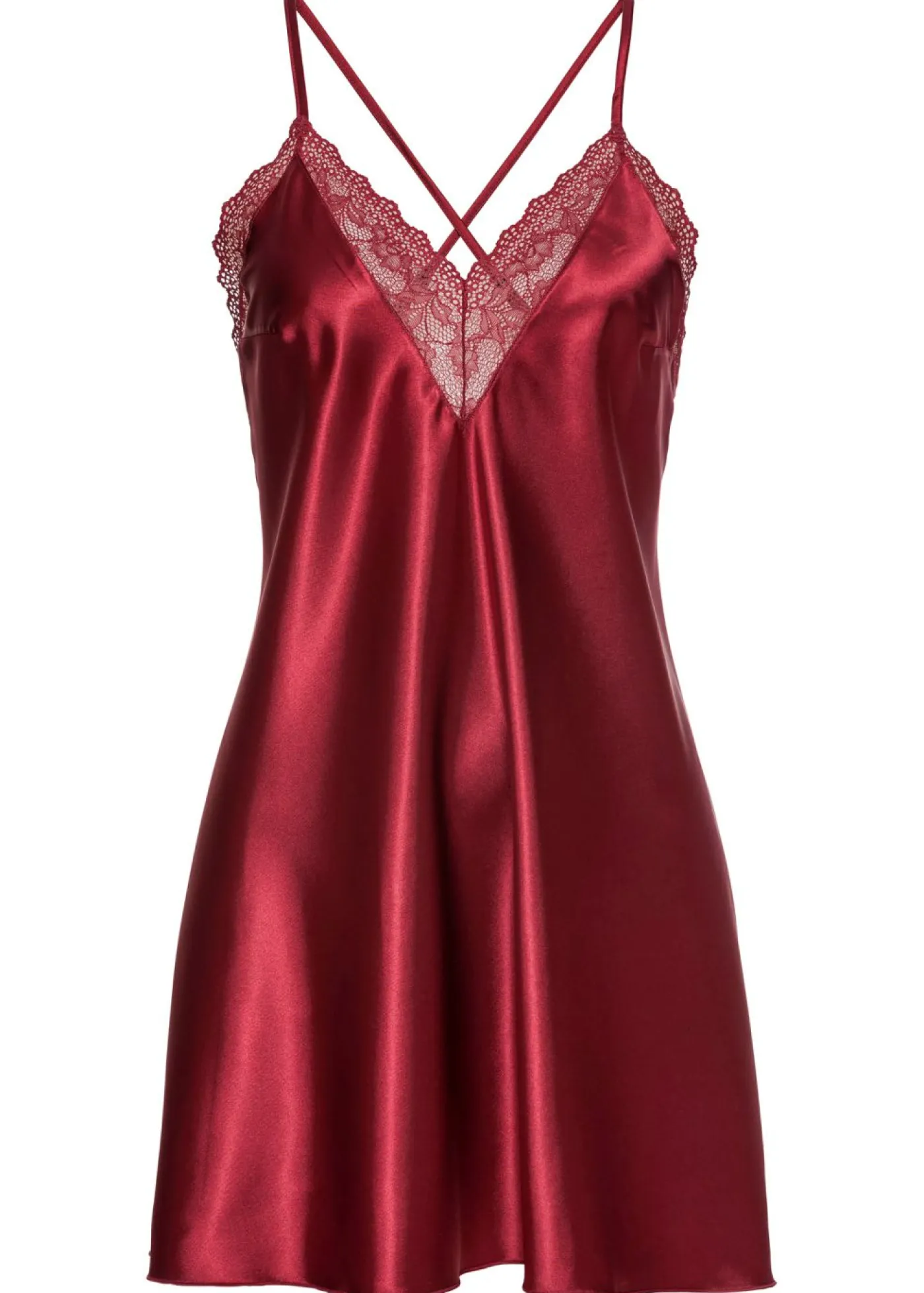 Negliglé moderno con inserciones sexy de encaje. El negligé en un moderno color rojo oscuro envuelve tus curvas femeninas. El material de alta calidad garantiza un ajuste cómodo. Una bonita inserción de encaje en el escote atrae todas las miradas. El negliglé también está disponible en tallas grandes.