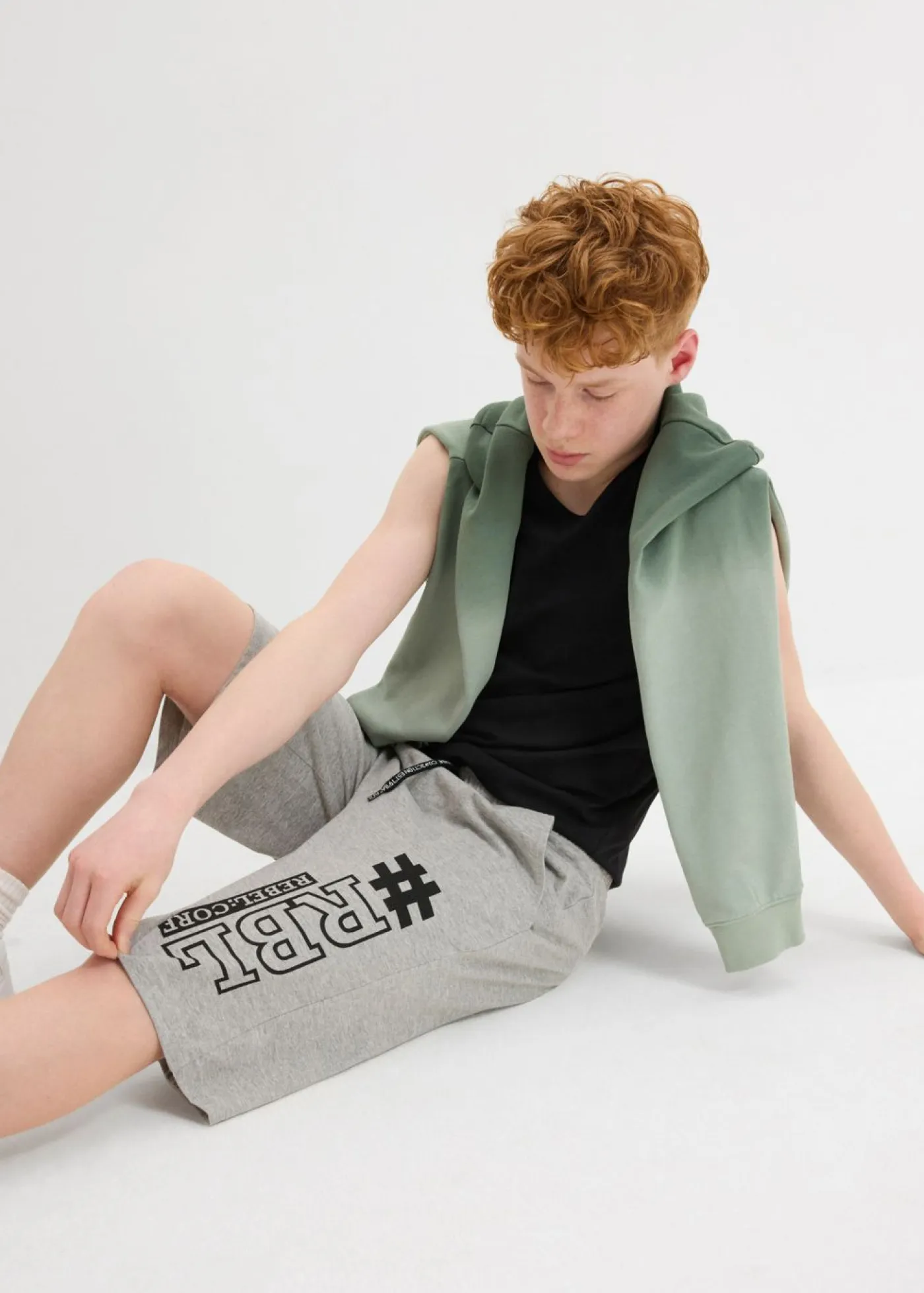 Bermudas de punto con estampado (2 unidades). Este paquete de 2 unidades consta de dos pantalones cortos de punto en diferentes colores. Las bermudas son especiales debido al fantástico estampado en la pierna izquierda. En combinación con una camiseta sin mangas informal o una sudadera con capucha, es una prenda imprescindible del estilo urbano.