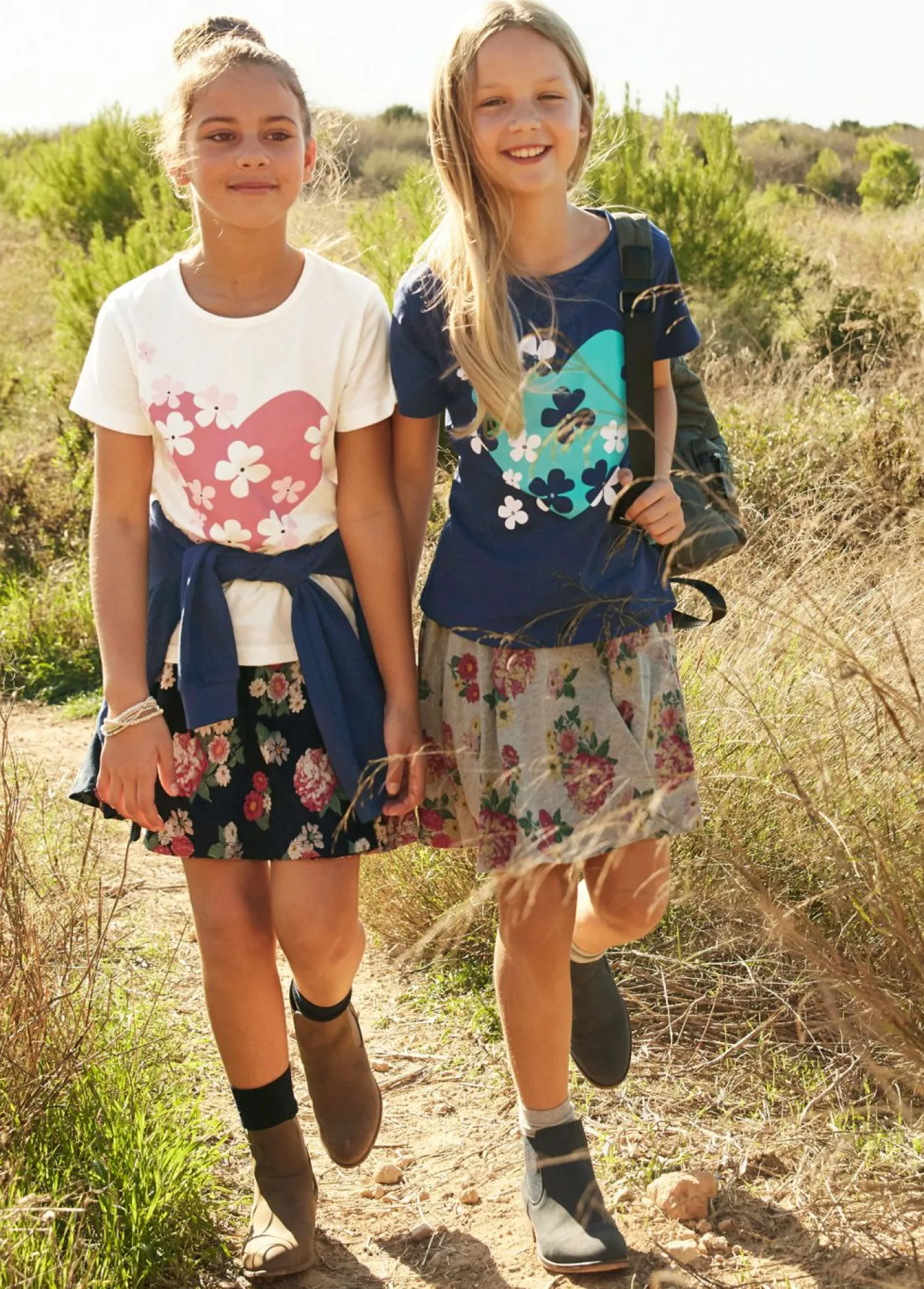 Conjunto doble de camisetas con estampado romántico para niñas. Fantástico conjunto de dos camisetas estampadas para niñas. El estampado con corazones y flores es particularmente romántico.