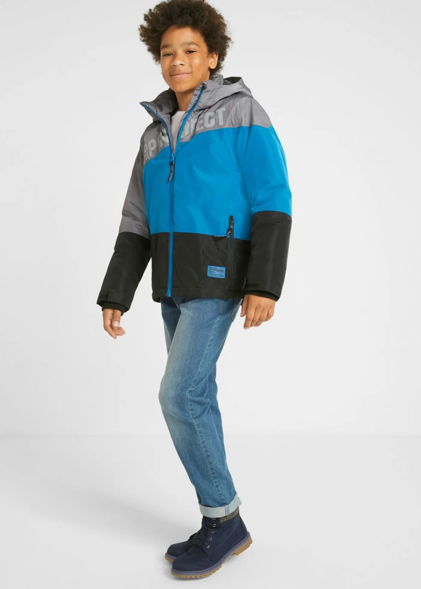 Moderna chaqueta de invierno con múltiples funciones. Esta moderna chaqueta de invierno convence por sus detalles funcionales y su diseño en tendencia. Dispone de cremallera y bolsillos en la parte delantera, así como de un bolsillo con cremallera en el pecho. La capucha y los cierres de velcro para ajustar la anchura de las mangas protegen contra el viento y las inclemencias del tiempo. Lo más destacado es el moderno estampado con texto y la combinación en tres colores.