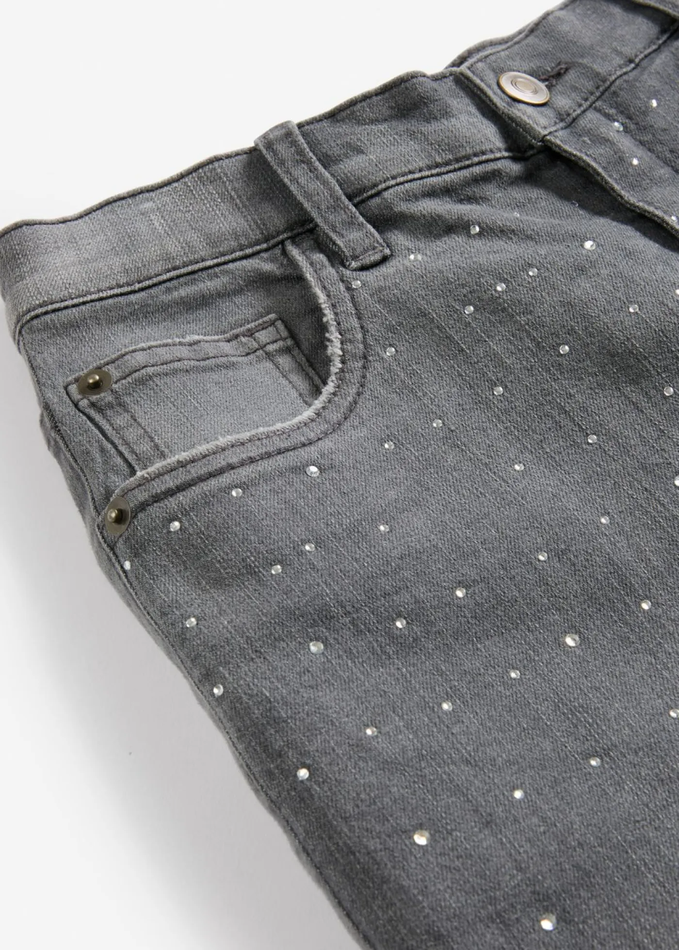 Vaqueros con perneras anchas, piedras brillantes y talle medio para niñas.