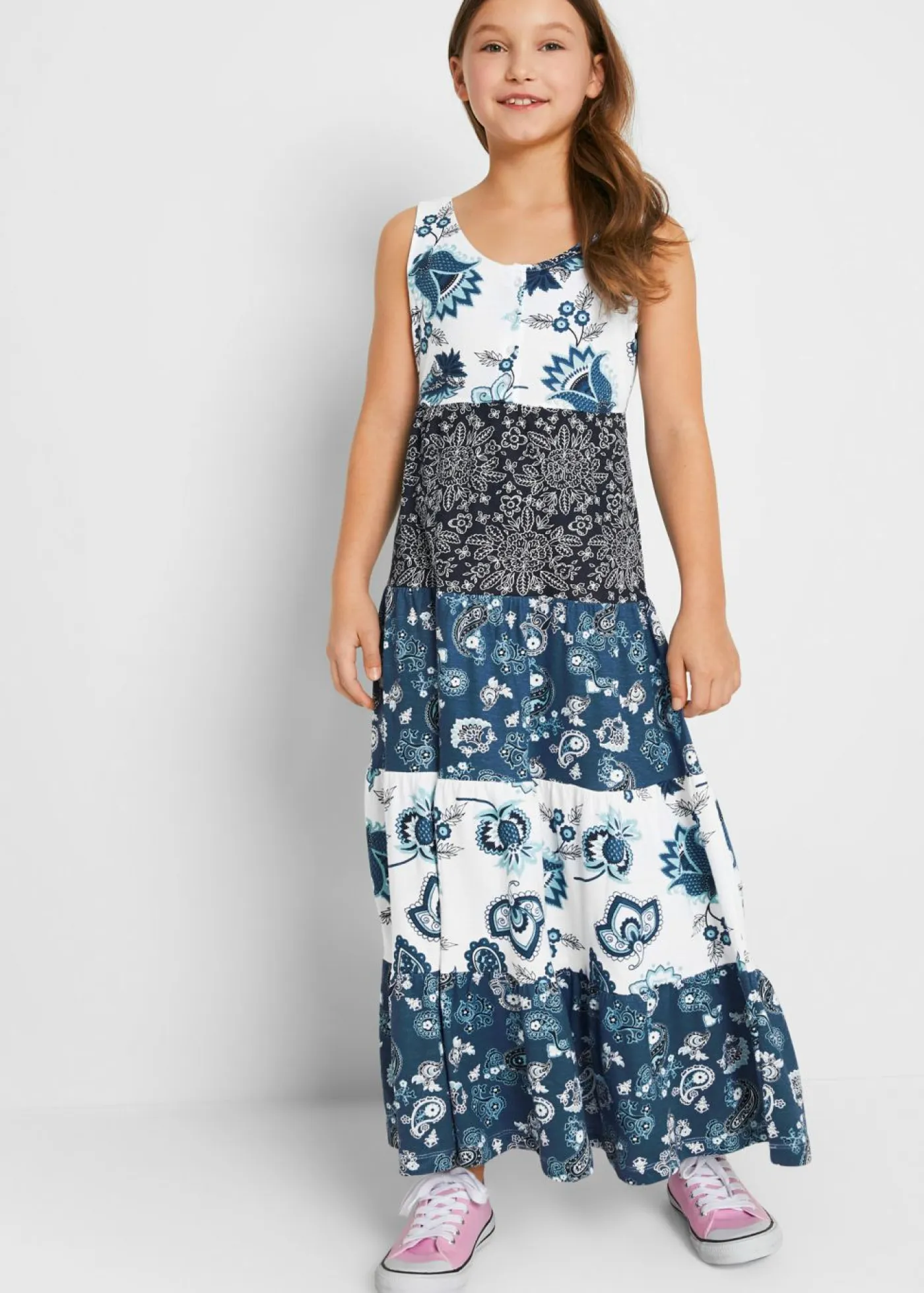Bonito vestido de verano con estampado de flores para niñas. Sugerente vestido con mezcla de estampados, tirantes anchos y falda larga. Incluye botones en la parte delantera del escote.